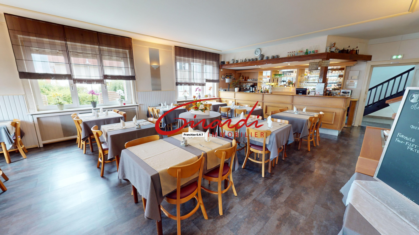 AU RDC: Un restaurant avec licence IV (en cours d'exploitation), 2 salles (60 couverts), une cuisine équipée aux normes, un bar et 2 terrasses extérieures
