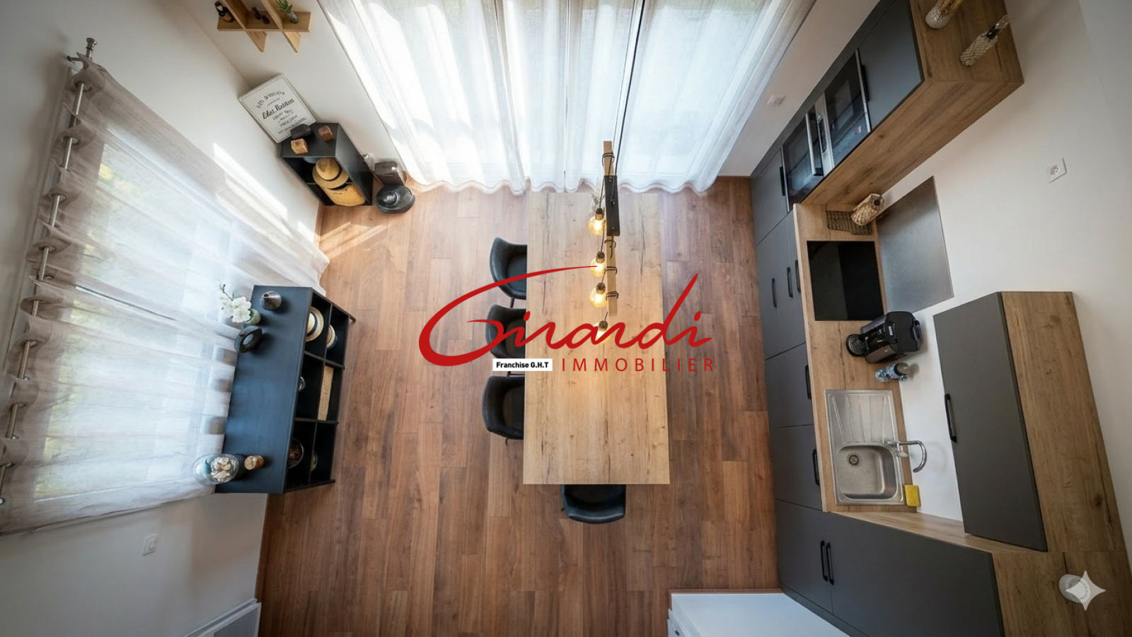 Au rez-de-chaussée : une entrée ouverte sur le salon-séjour, une cuisine entièrement équipée avec accès direct à l’extérieur, ainsi qu’un WC séparé.