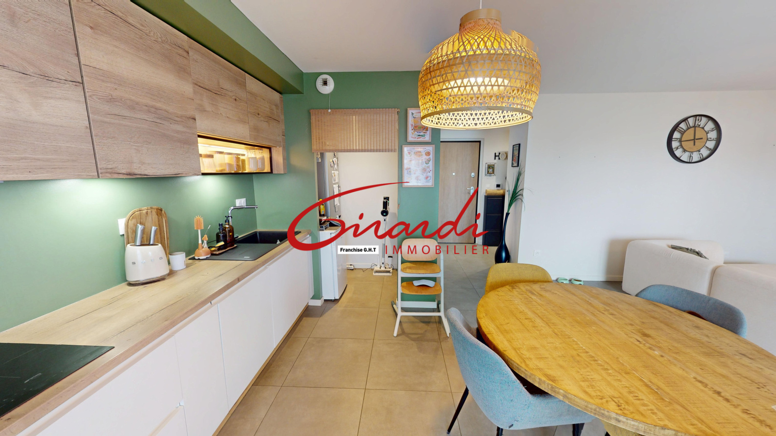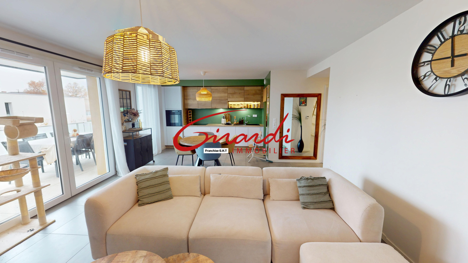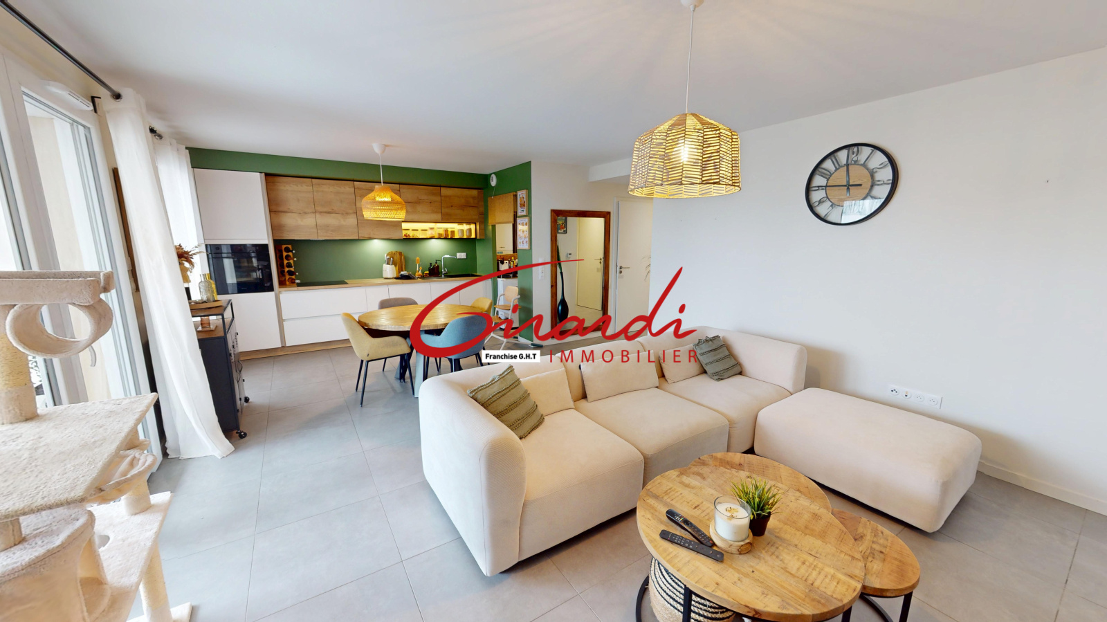 Dès l’entrée, un grand placard de rangement mène à une belle pièce de vie de 31 m², lumineuse et conviviale, avec une cuisine entièrement équipée ouverte sur le salon-séjour et un accès direct à une terrasse exposée plein sud.