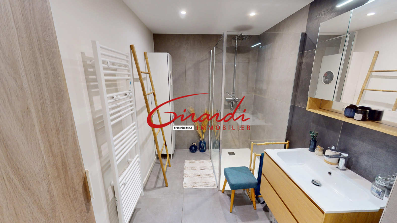 Côté nuit, deux chambres, une salle d’eau avec douche à l’italienne, meuble vasque et sèche-serviette soufflant, ainsi qu’un WC séparé avec lave-mains.