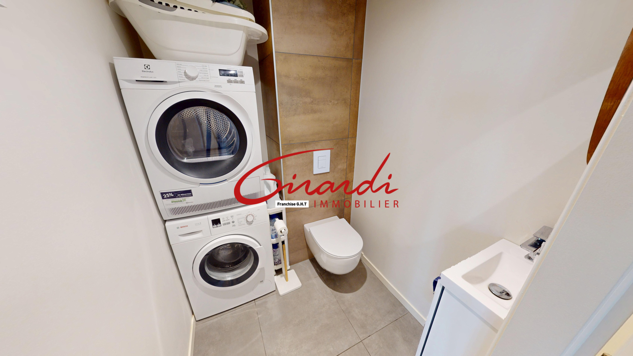 Les arrivées d’eau dans le WC y permettent l’installation de la buanderie et de la machine à laver.