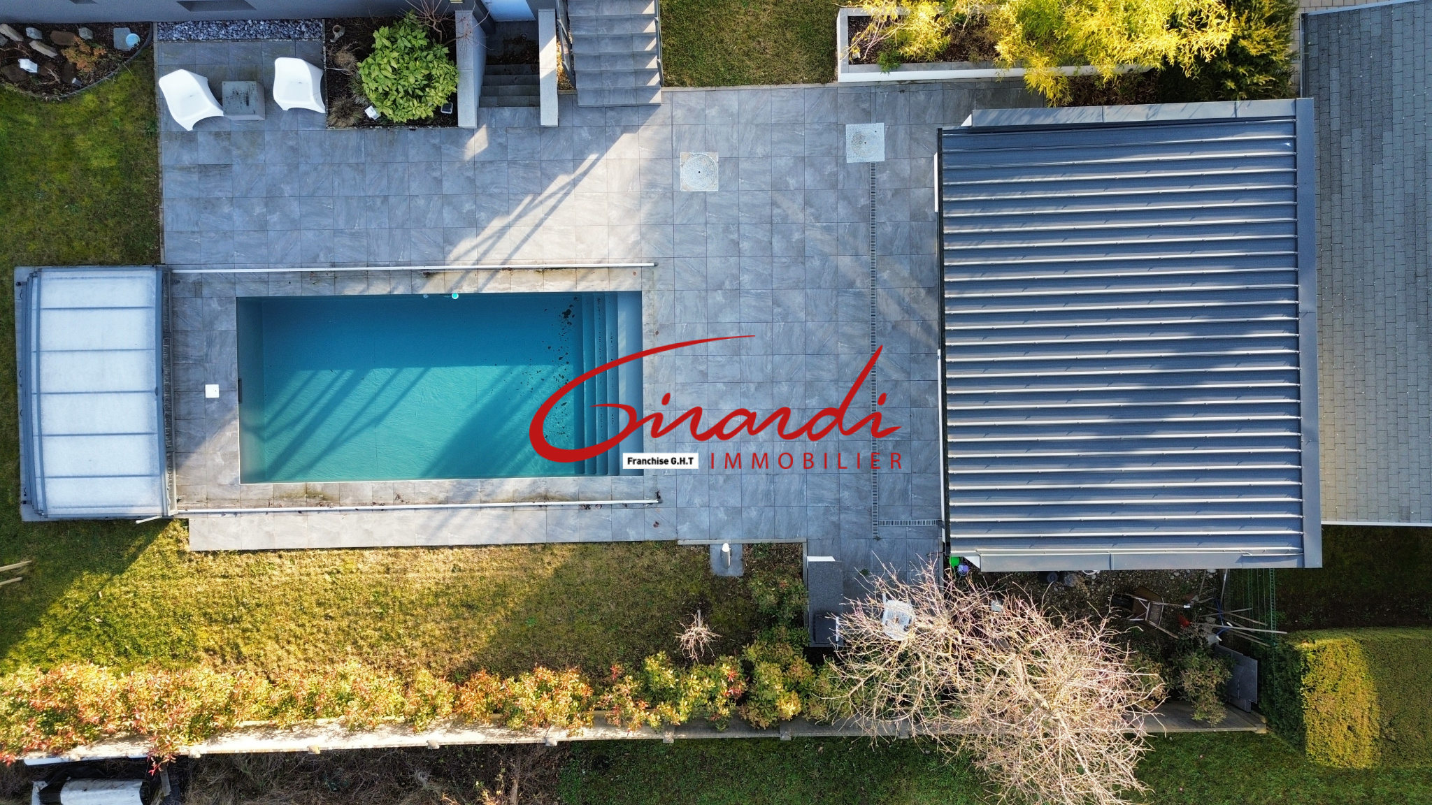 A l'extérieur : le jardin est clos, arboré et équipé d'une poolhouse et d'une piscine couverte.