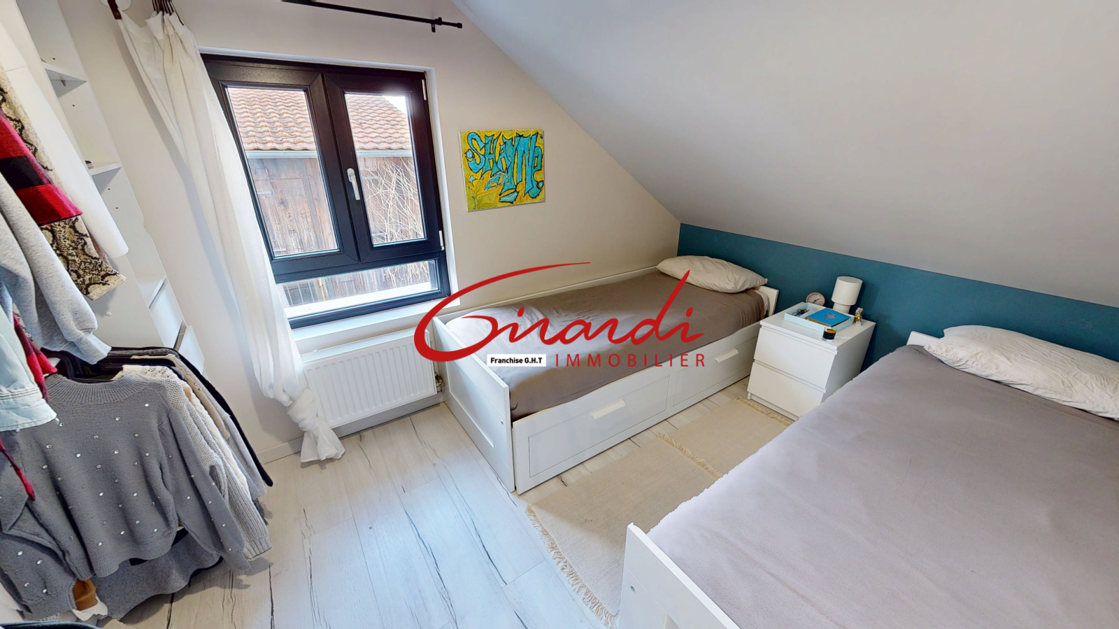 Dans quartier calme et résidentiel à Richwiller, maison individuelle entièrement rénovée de 147m² sur 5 ares de terrain paysagé et clos, avec prestations haut de gamme et permettant de vivre en plain-pied/ Au RDC une entrée avec placards intégrés, une superbe cuisine équipée neuve, ouverte sur un lumineux salon-séjour double le tout faisant 45m², une chambre de 13m², une salle d'eau meublée avec douche à l'italienne, un wc suspendu indépendant avec lave-mains, une grande buanderie avec de nombreux rangements intégrés, et un cellier./