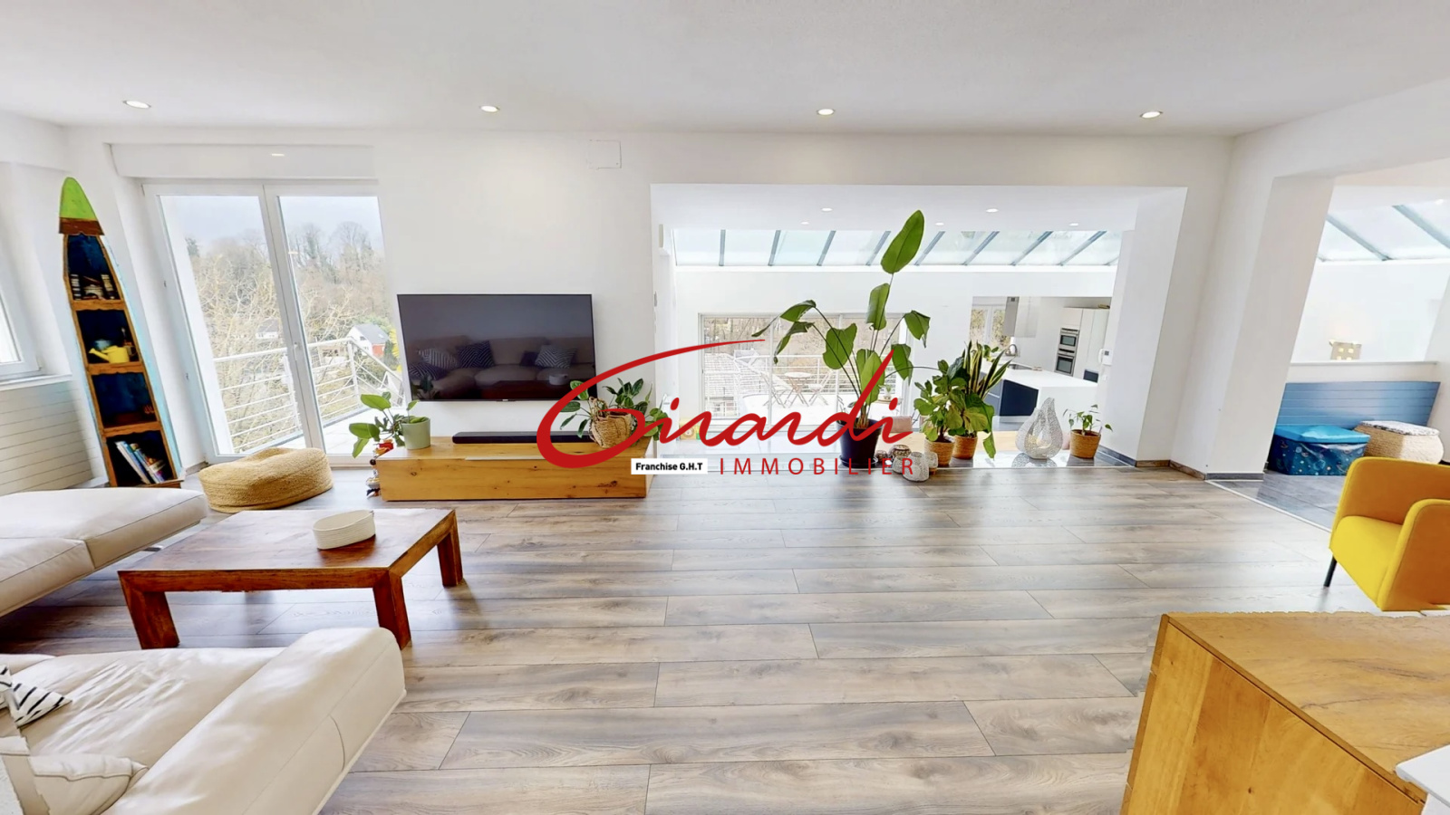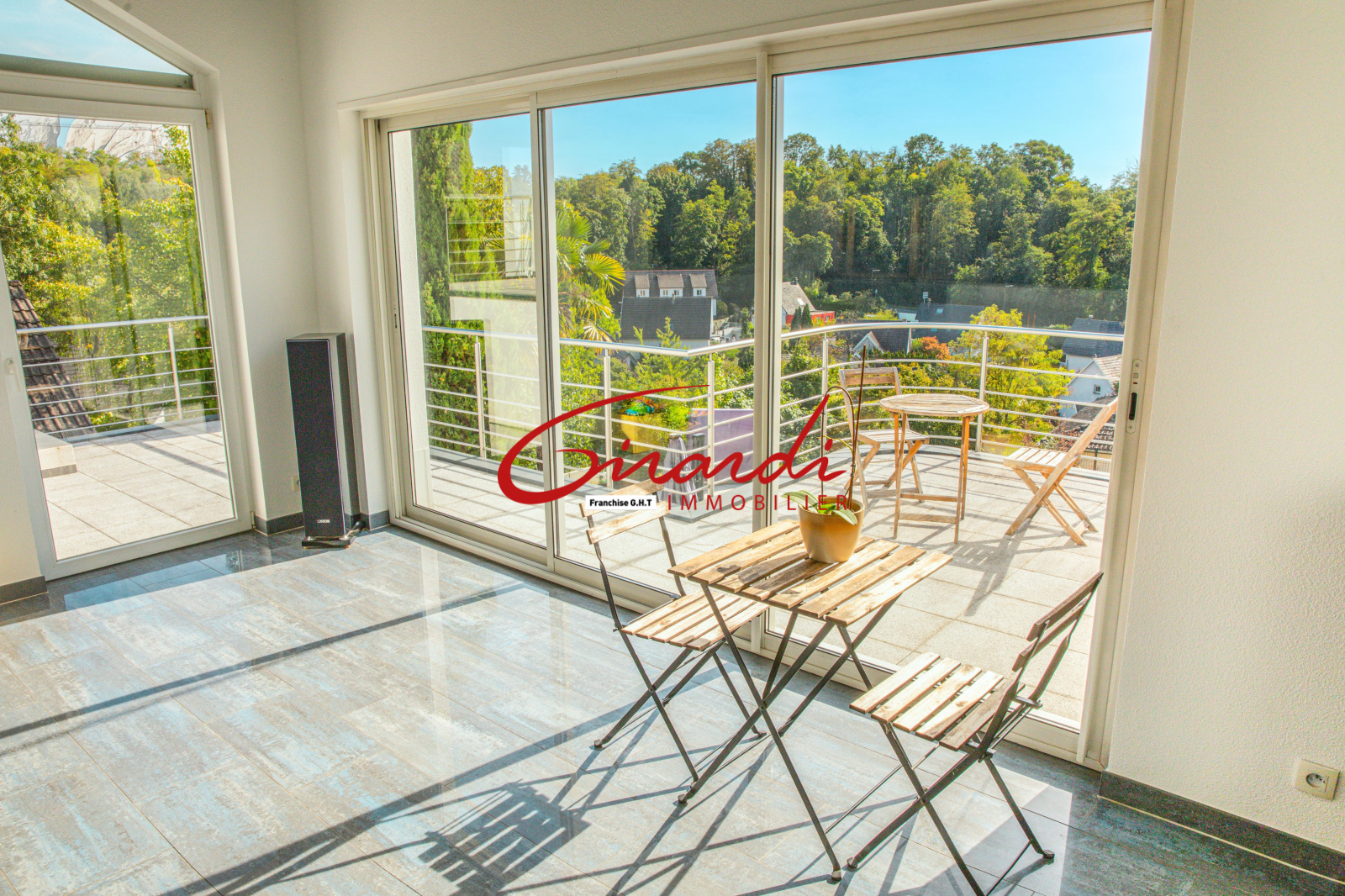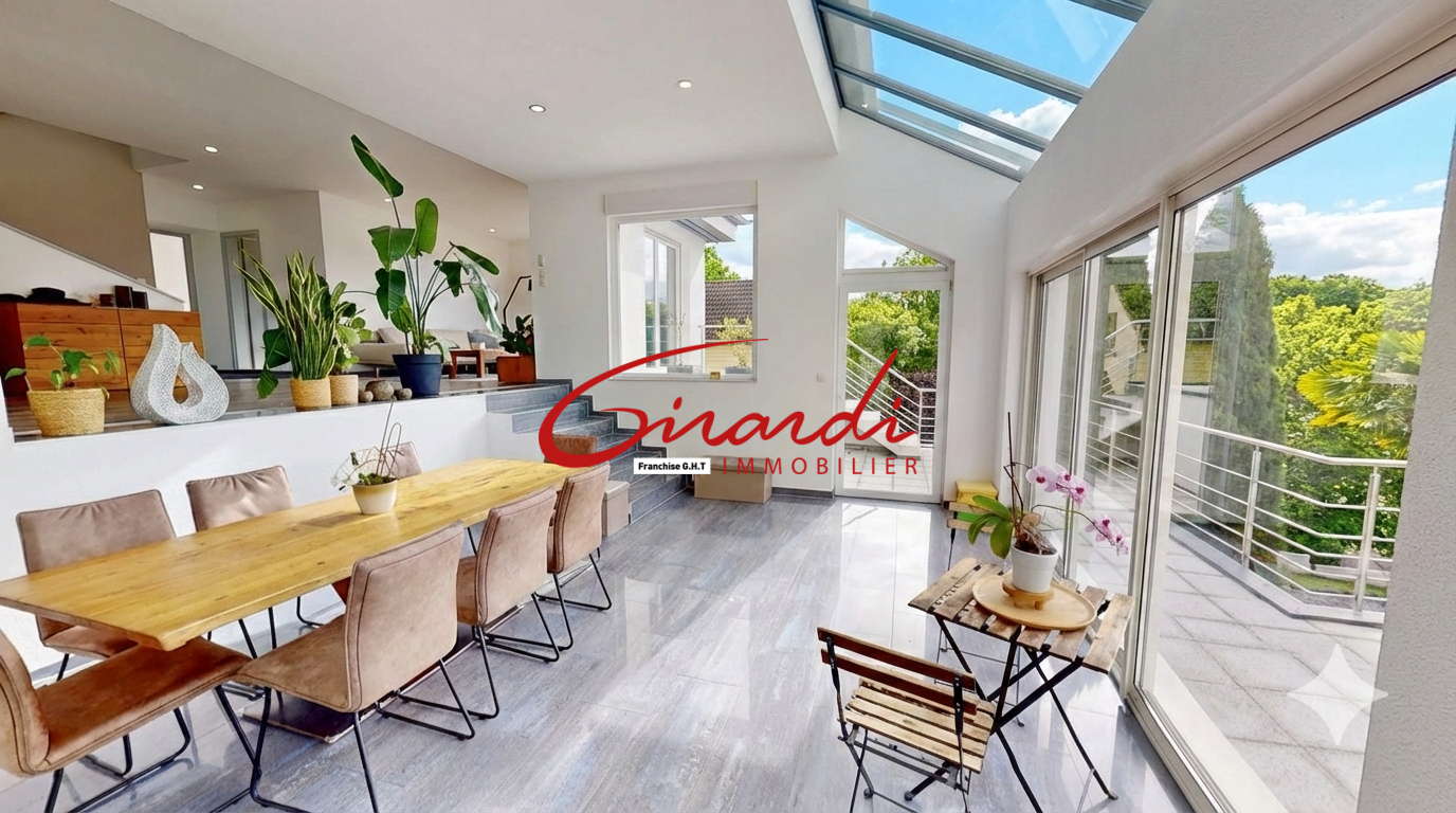 Sur les hauteurs de Brunstatt /quartier Rebberg au calme maginifique villa 9p de 307m² nichée dans un cadre de verdure avec superbe vue , la maison a été agrandie par rapport à l'origine par un architecte, ce qui lui confère un charme unique , on retrouve notamment une magnifique verrière , des demis niveaux , la luminosité est le mot d'ordre dans cette maison