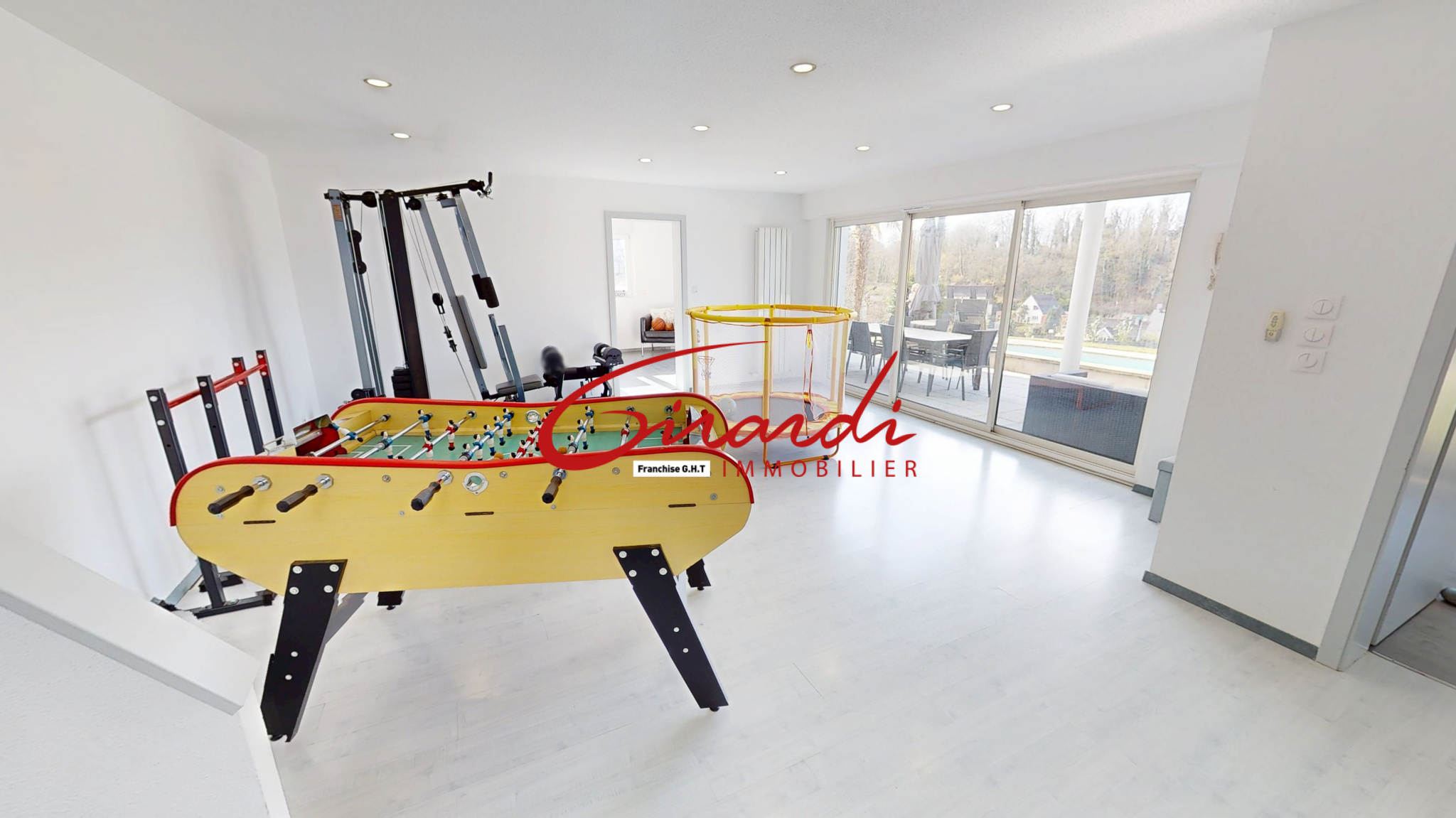 au Rez de sol on trouve 3 belles pièces , une salle de jeux ouverte de 28 m2 , 2 chambres de 12,54 et 19 m2 , une salle d'eau meublée avec son toilette , on a accès à une seconde terrasse exposée sud avec accès direct à la piscine et au jardin