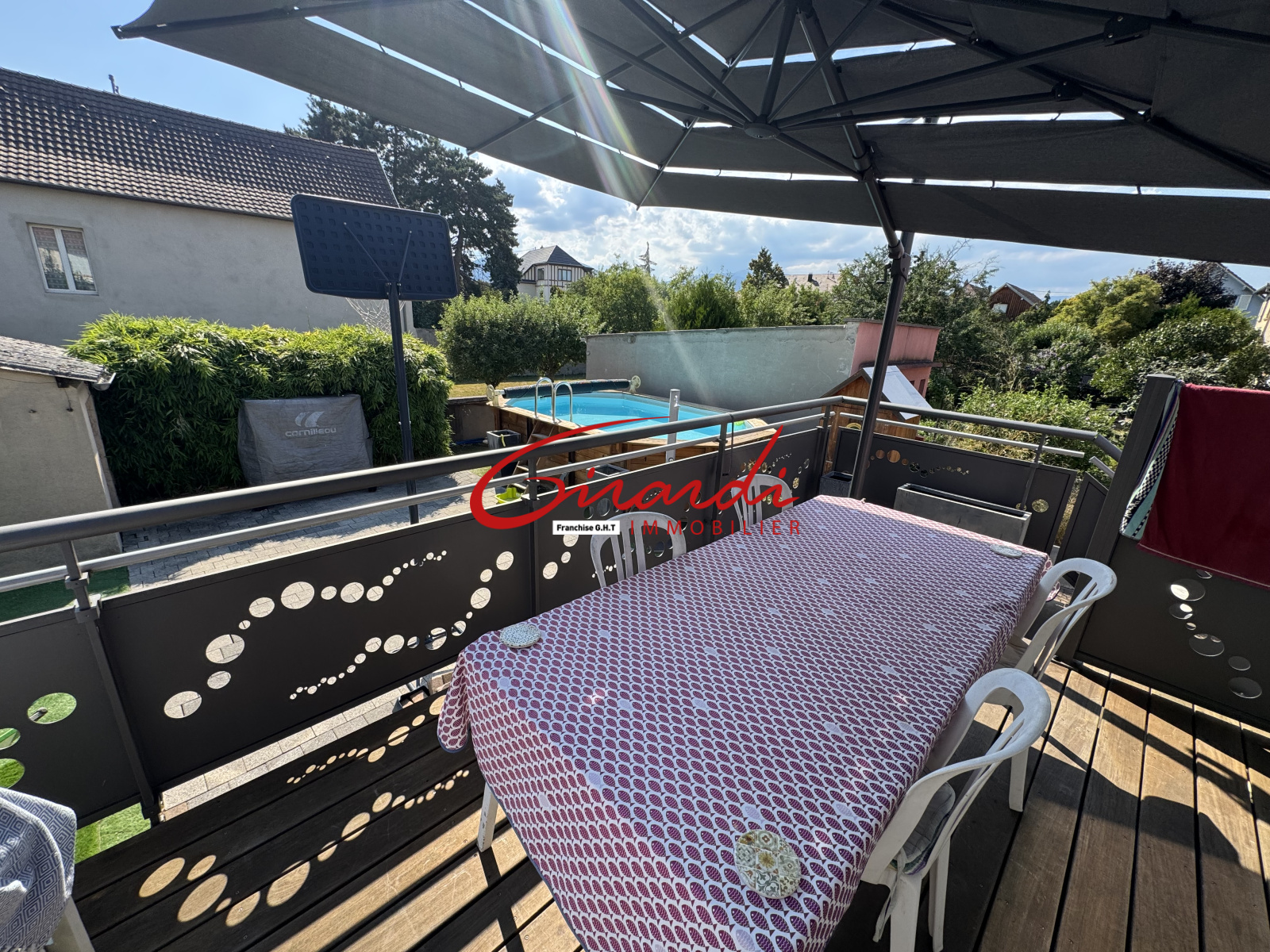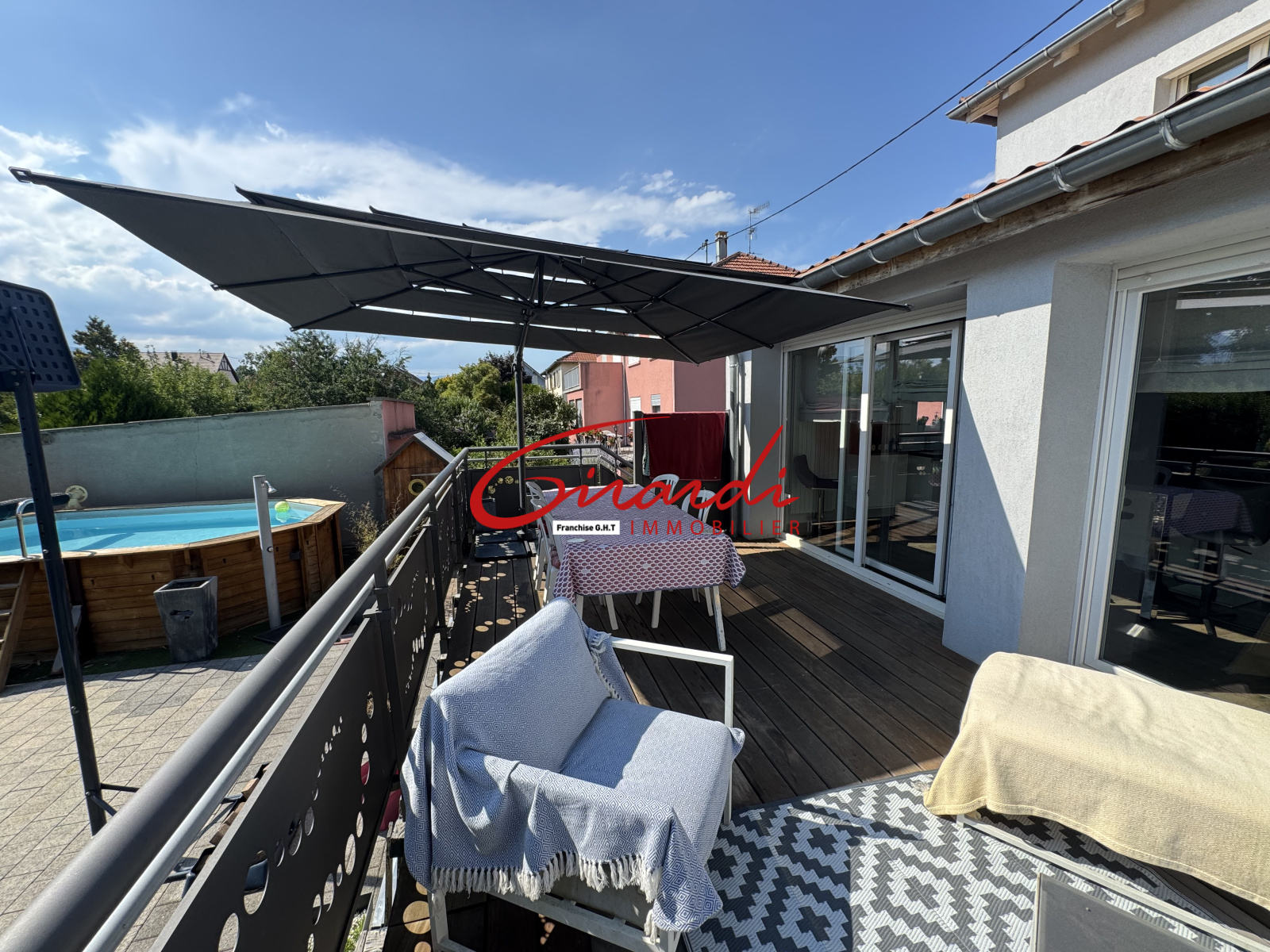 À l’extérieur vous profitez d’un jardin clos avec terrasse et piscine hors sol un espace sans entretien particulier.