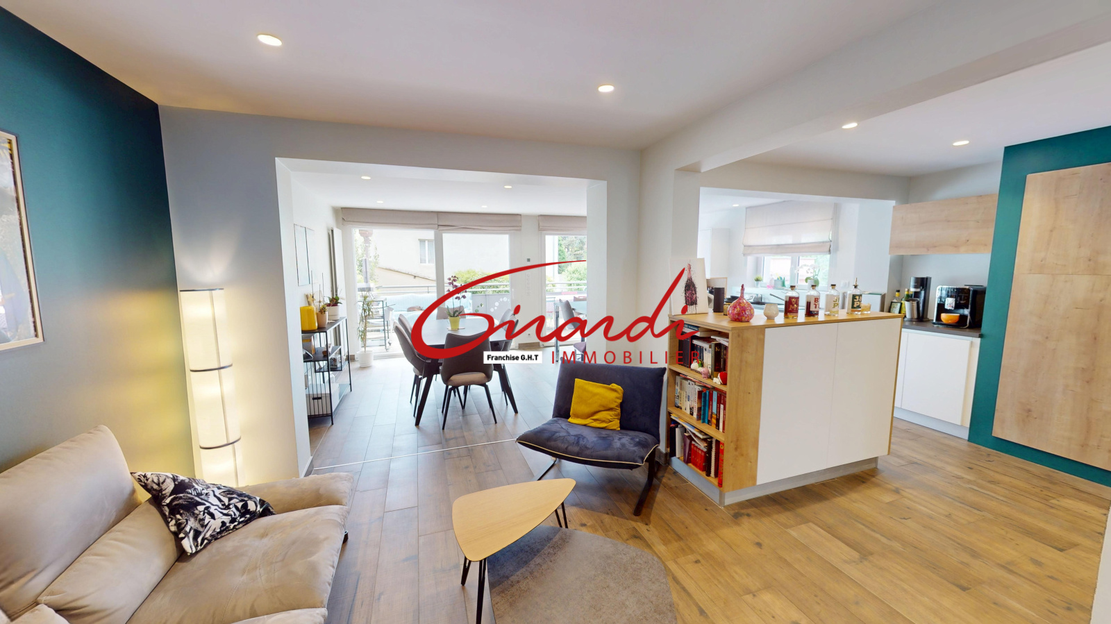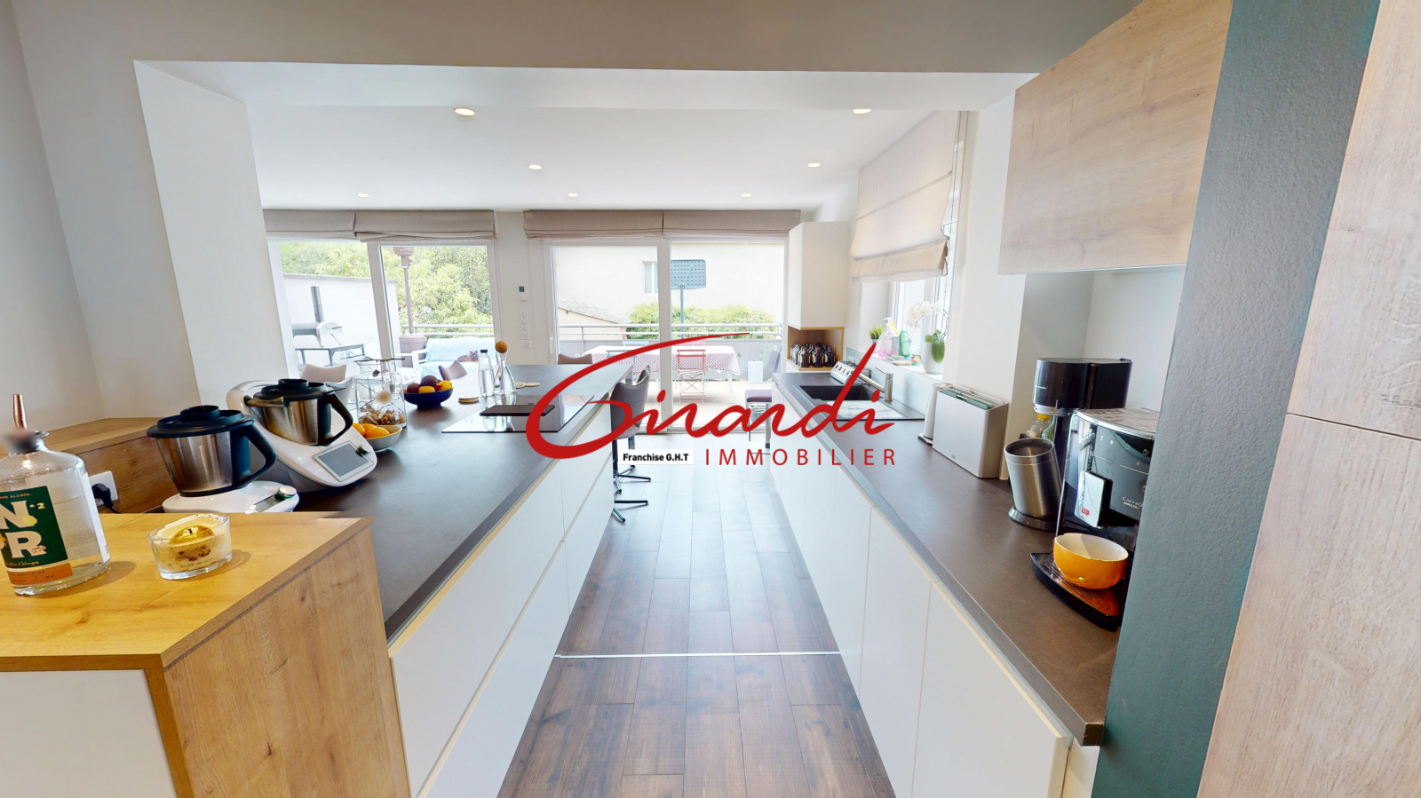 La pièce de vie traversante comprend un salon, un séjour et une cuisine ouverte entièrement équipée avec un vaste plan de travail. Cet espace donne directement accès à une grande terrasse exposée plein sud.