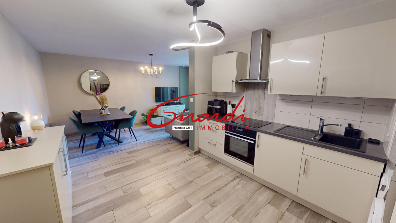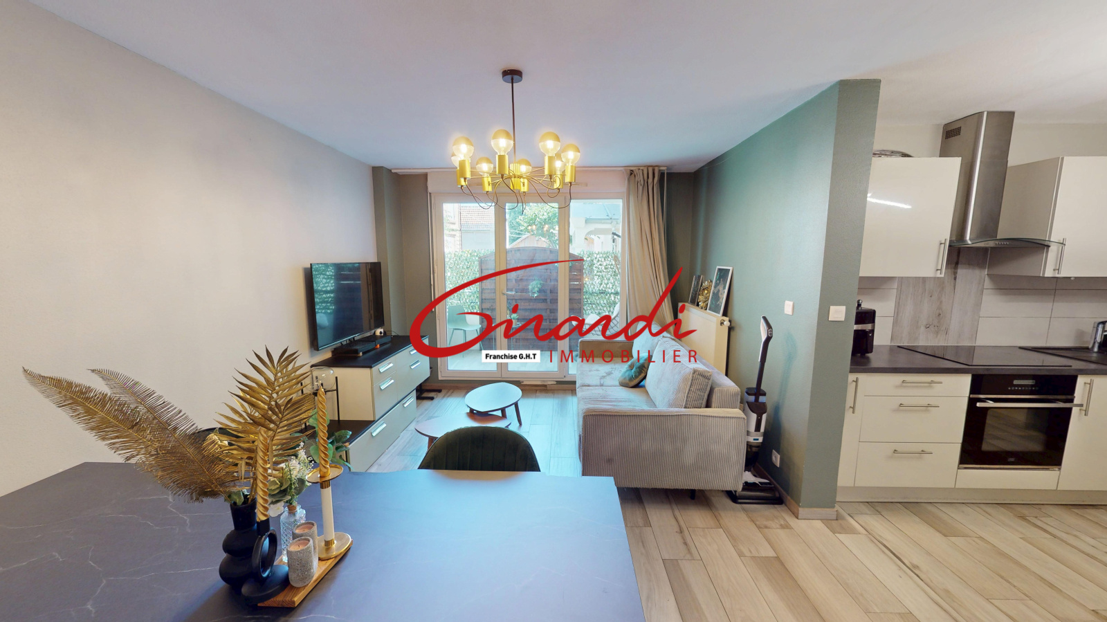 L’entrée s’ouvre sur un dégagement avec de nombreux rangements sur mesure, menant à une pièce de vie lumineuse avec une cuisine équipée (plaque induction et hotte) ouverte sur le séjour. L’espace salon donne accès à une agréable terrasse orientée Est.
