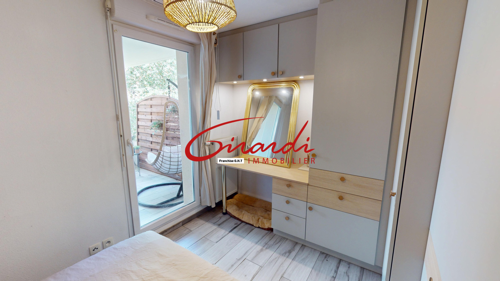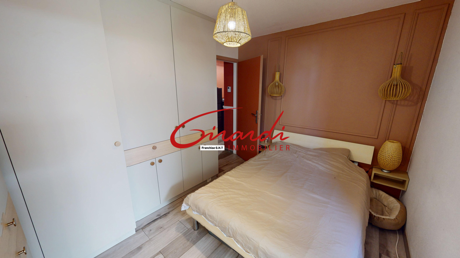 La chambre, spacieuse et bien agencée, dispose de grands placards muraux réalisés sur mesure et d’un coin bureau. Elle bénéficie également d’un accès direct à l’extérieur par la terrasse, idéal pour profiter des beaux jours.