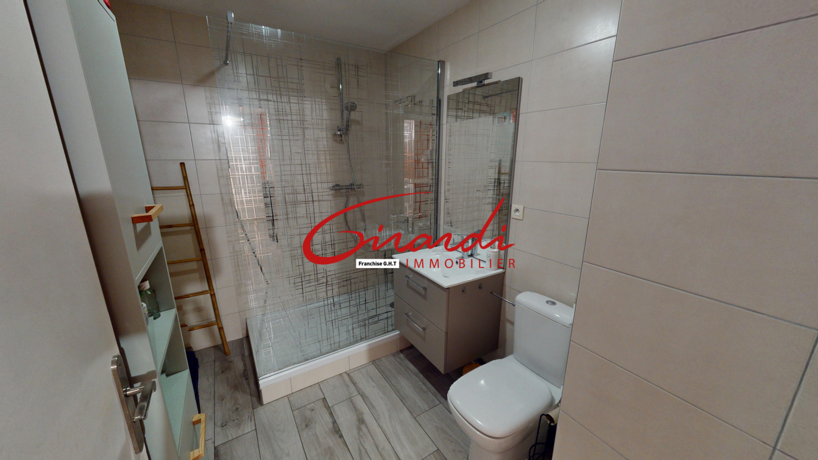 La salle d’eau, moderne et bien agencée, est équipée d’une douche, d’un meuble vasque et d’un WC. Un lave-linge y est également installé et reste en place.